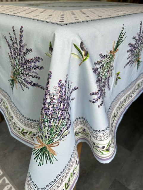 Acrylic coated cotton tablecloth with a wipe-clean finish. In light blue with lavender and olive placee design.